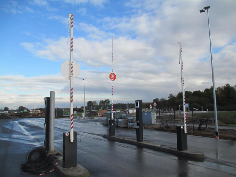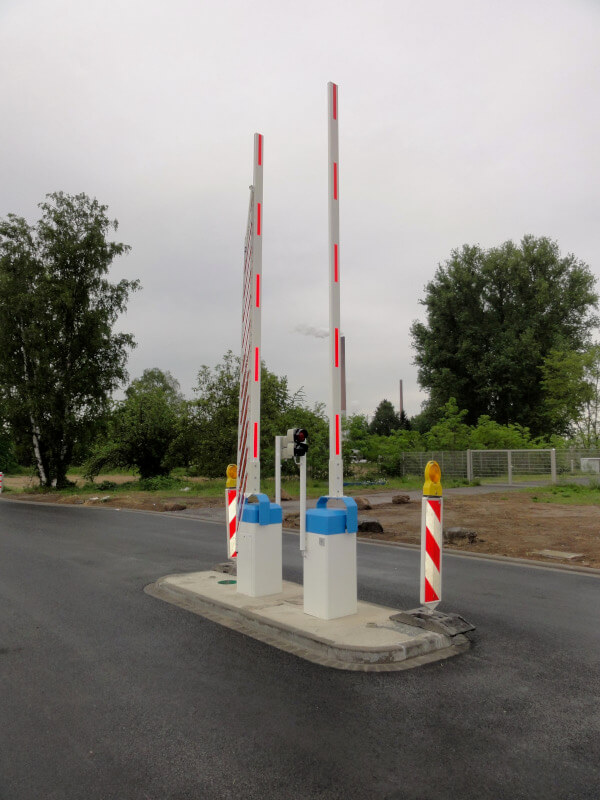 Die Anlagen gibt es teils verzinkt oder zusätzlich pulverbeschichtet. Im Ruhezustand wird der Schrankenbaum durch einen verschließbaren Aufschlagpfosten gestützt und gesichert.